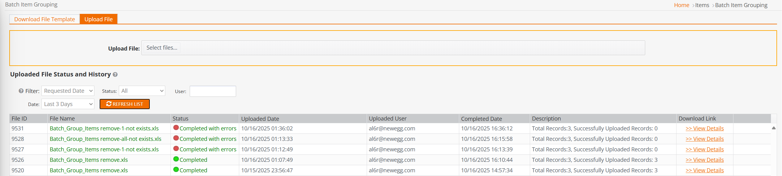 - Once finished, users can check the processing results in the Uploaded File – Status and History table, by clicking the >>View Details error report.