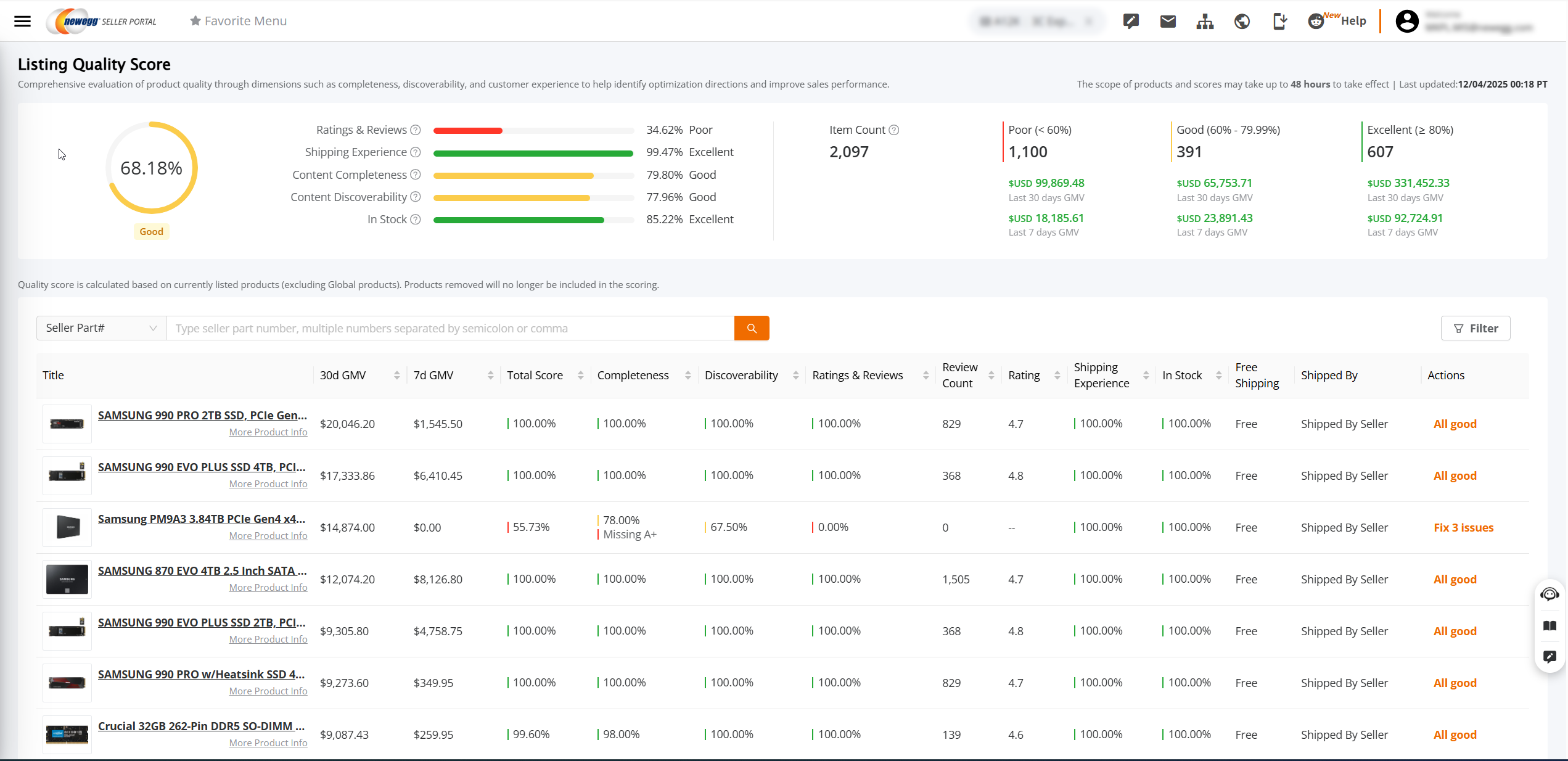 - Filtering: Filter products by GMV, rating, review count, or individual quality score dimensions to quickly identify priority items for optimization.