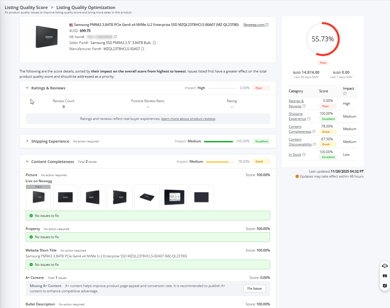 - Clicking Overall Quality Score, Completeness, or Discoverability also navigates to the Listing Quality Optimization Page to view detailed scores and improvement items for optimization.