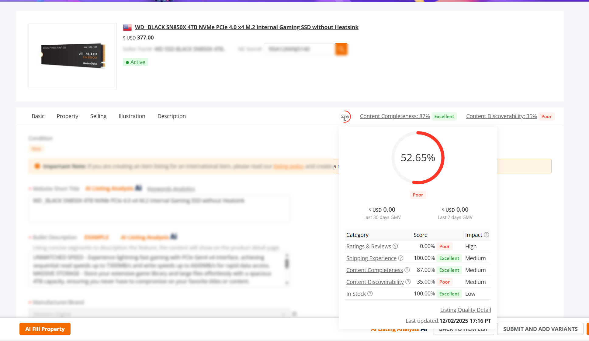 - Navigates to the Listing Quality Optimization Page, where sellers can view detailed scores and items that need improvement, and optimize product content accordingly.